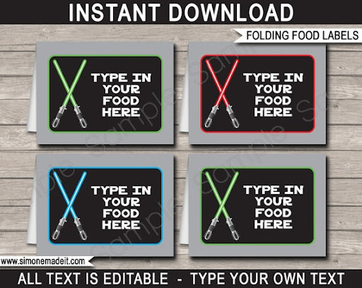 Star Wars Party Food Labels template - SIMONEmadeit Parties Edit and print these Star Wars Party Food Labels as many times as you like. INCLUDED TEMPLATES Instructions PDF file (black background) with 4 x labels per page PDF file (white background) with 4 x labels per page Each label is 3⅓ x 2½ inches once cut & folded. Pin HOW IT WORKS TEMPLATE SPECS LATEST REVIEWS 1. INSTANT DOWNLOAD